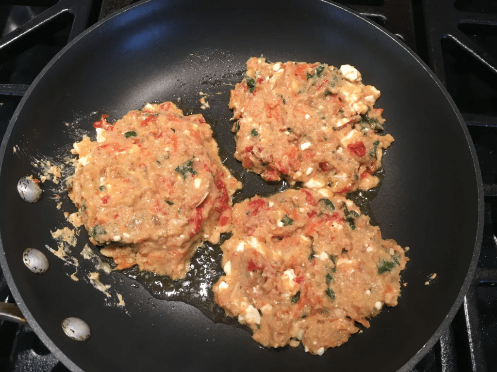 Sauté onion and garlic in a small amount of olive oil. Mix all ingredients in a large bowl and drop by large spoonfuls into a pan glazed with olive oil. Pat the cakes flat. Sauté until browned; flip and brown on the other side. Alternatively, you can place on parchment or a silpat on a cookie sheet and bake for about 15-20 minutes in a 350-degree oven. Repeat with the rest of the batter.