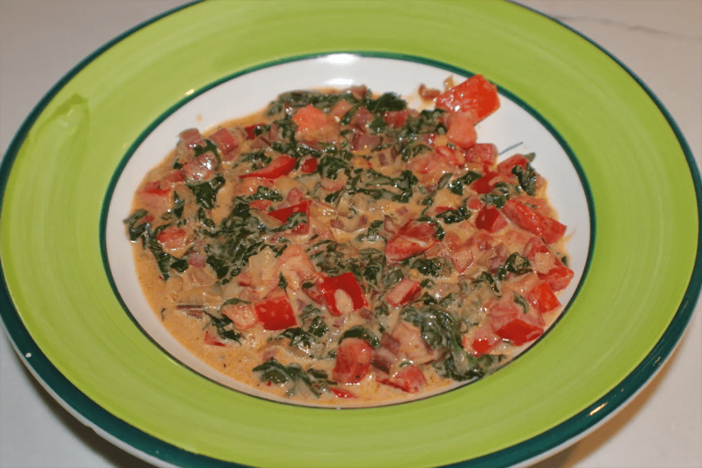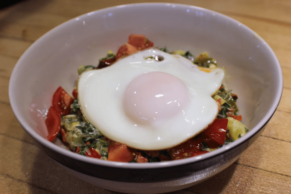 Rinse the greens liberally and remove tough stems. Stack the leaves and roll them into a “cigar” and slice thinly. Add garlic and onion to olive oil in a heavy pan and saute until tender. Fry eggs in a separate pan if you intend to use them. Add greens, vinegar and sugar and saute for about 5 minutes until greens are tender. Turn off the heat and stir in tomatoes and sour cream or yogurt. Salt and pepper to taste. Top with eggs and sriracha if desired.