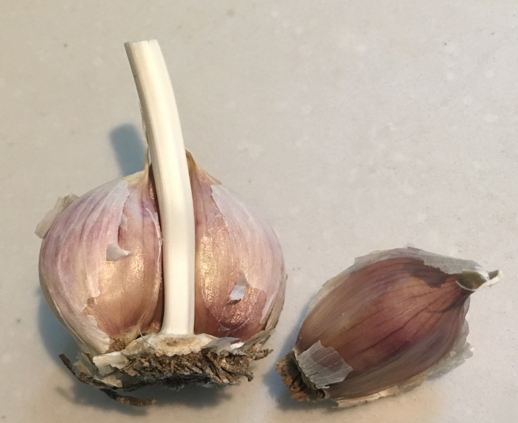 I’ve always had the best production from hard neck types of garlic and, although this type doesn’t keep quite as well as soft neck, the flavor is more intense. Hard neck garlic sends up a tall stalk in the middle of the leaves in early June. The stalks are topped with curly seed heads called scapes, which should be pinched out to allow the plants to put more energy back into the bulbs. The scapes are edible and can be used in any way you normally use garlic cloves. Soft neck garlic has no central stalk and will keep for six to nine months if properly cured.