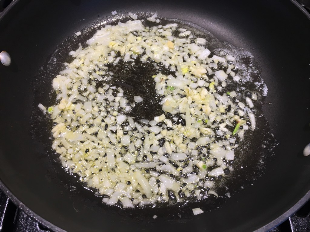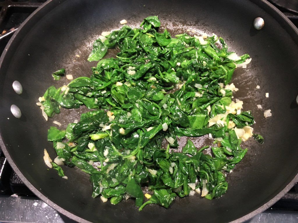 Minced onion and garlic sauteed in a little olive oil and a touch of butter brings a simple green like spinach to something sublime. This is a wonderful dish all by itself, but can also be added to soups, stews, risotto, eggs………only limited by imagination.