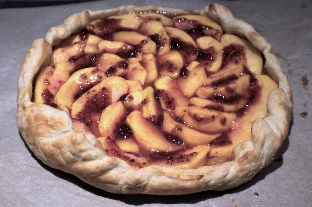 Heat jam; spread jam in the center of the circle, leaving ¼ inch border around the edge of the dough. Place prepared fruit on top, leaving a 1 ½ -inch border around the edge of the dough.