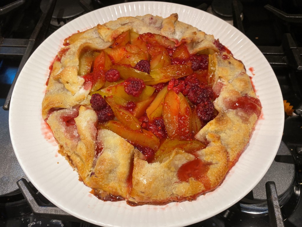 I bought a box of produce from a local farmer this week and it came with plums, raspberries and grapes. I made a plum and raspberry galette. Sounds like it may be complicated, but it’s not. And any of the fruits can be swapped for whatever is coming in at the time. Once your fruits are prepared, it takes less than an hour to make including baking time. You could have a different flavor every night of the week. And the possibilities to use vegetables and cheeses make it an endless supply of opportunities.