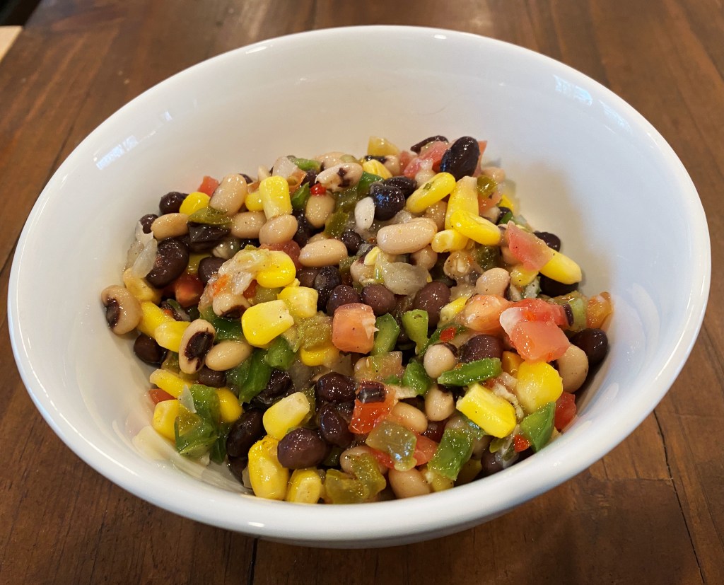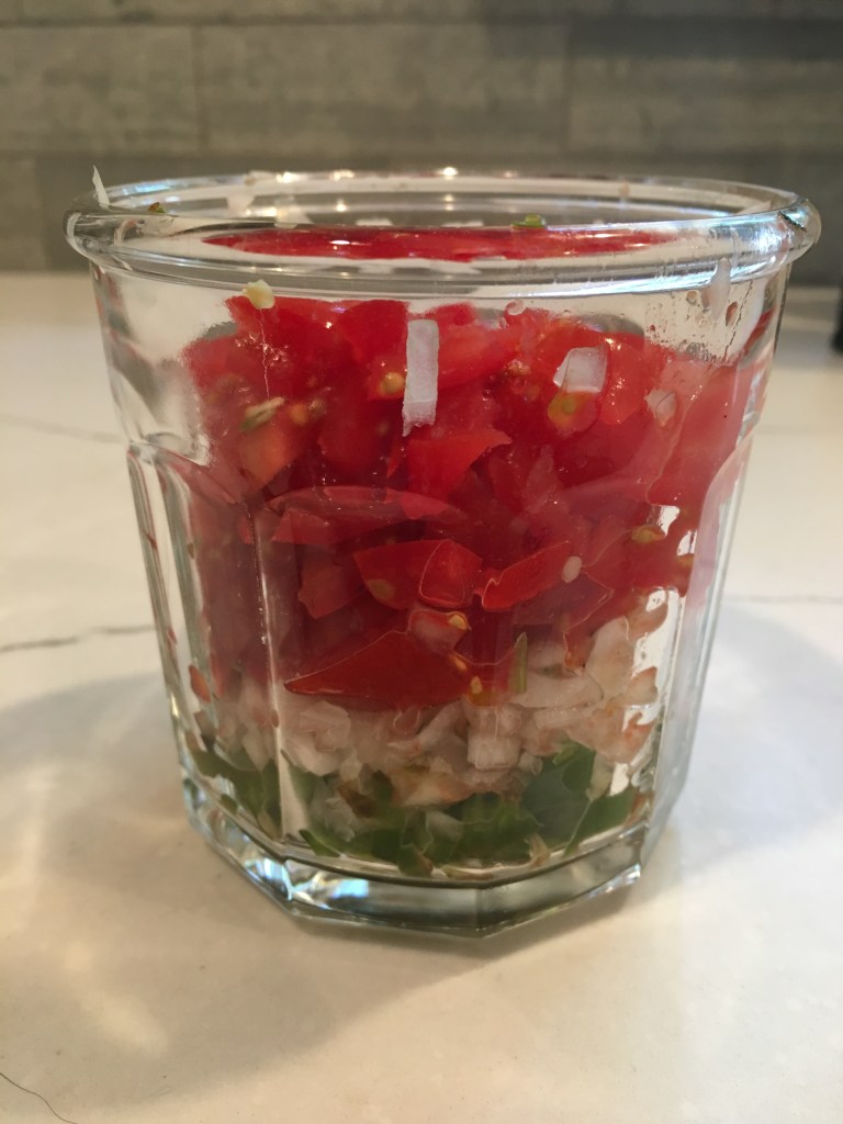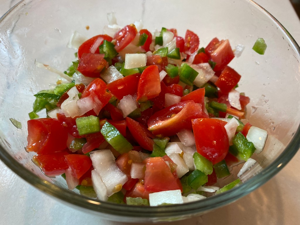 I tend to rely on vegetables I froze last summer, but you can also buy them fresh. Even supermarket tomatoes are suitable for jazzing up in a salsa. The peppers and onions give them flavor. You can also use frozen corn, canned artichoke hearts, canned beans and even frozen mango if you want to make a fruity salsa.