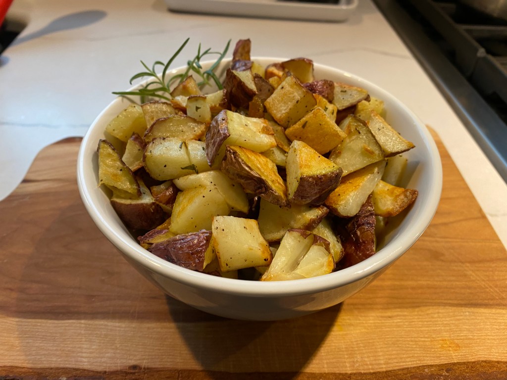 Toss the cut potatoes with 2-3 tablespoons of fruity olive oil and salt and pepper to taste. Place the potatoes, cut side down, in one layer in a shallow baking pan. Lay three or four sprigs of fresh rosemary on top. Put on the lowest rack in a cold oven. Turn on the heat to 425 and roast until tender, usually about half an hour. No need to turn the potatoes over. Remove the rosemary and serve warm or at room temperature.