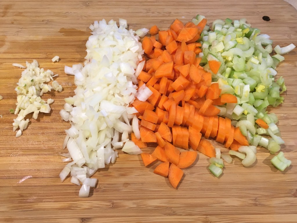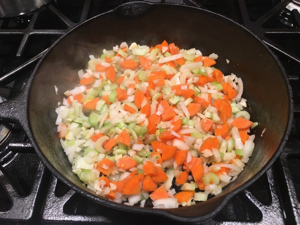 Chop a small onion, small carrot and a couple of stalks of celery. Saute gently in two tablespoons of olive oil until somewhat soft but not browned. While sauteeing, add seasonings and herbs to allow them to “bloom” in the oil. This process releases the flavors to infuse your soup.