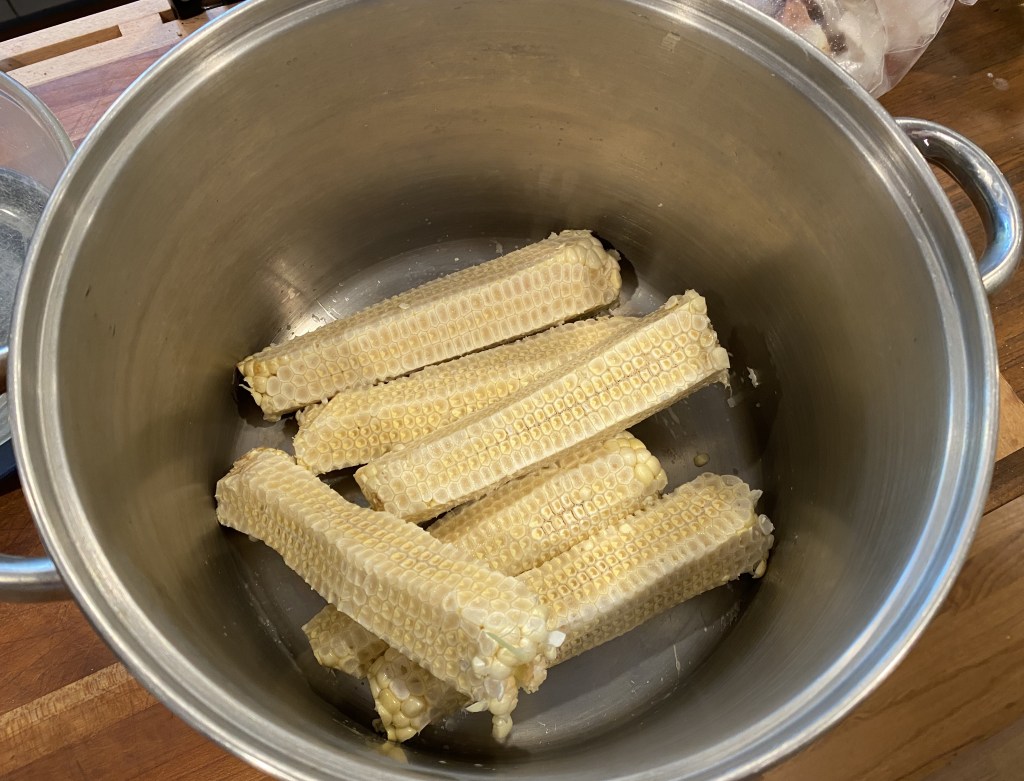 Cut the kernels from the cobs and then use the back of the knife to scrape all the “milk” into a cup. Save the cobs to make stock.