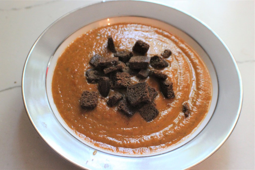 Remove from the oven and cool slightly. Add basil and puree with a hand or countertop blender. You can puree it until smooth or leave it somewhat chunky. Stir in half-and-half or another cream if you wish and season to taste with salt, pepper and even cayenne if you want a little spunk. Pour into bowls and garnish with garlic croutons, scallions, feta or goat cheese, or parmesan.
