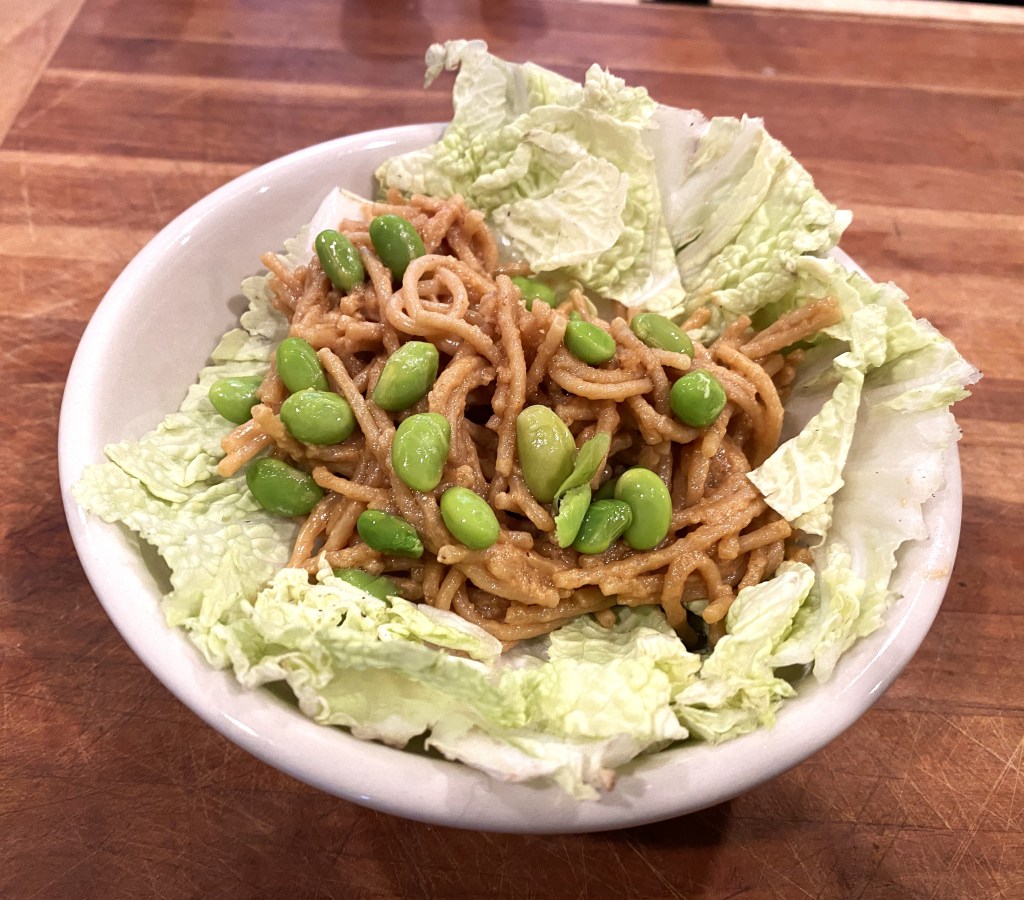 These noodles pair well with thinly sliced napa cabbage, shredded carrots, cooked edamame, scallions, shredded beets, steamed and chopped broccoli or cauliflower, and shredded romaine.