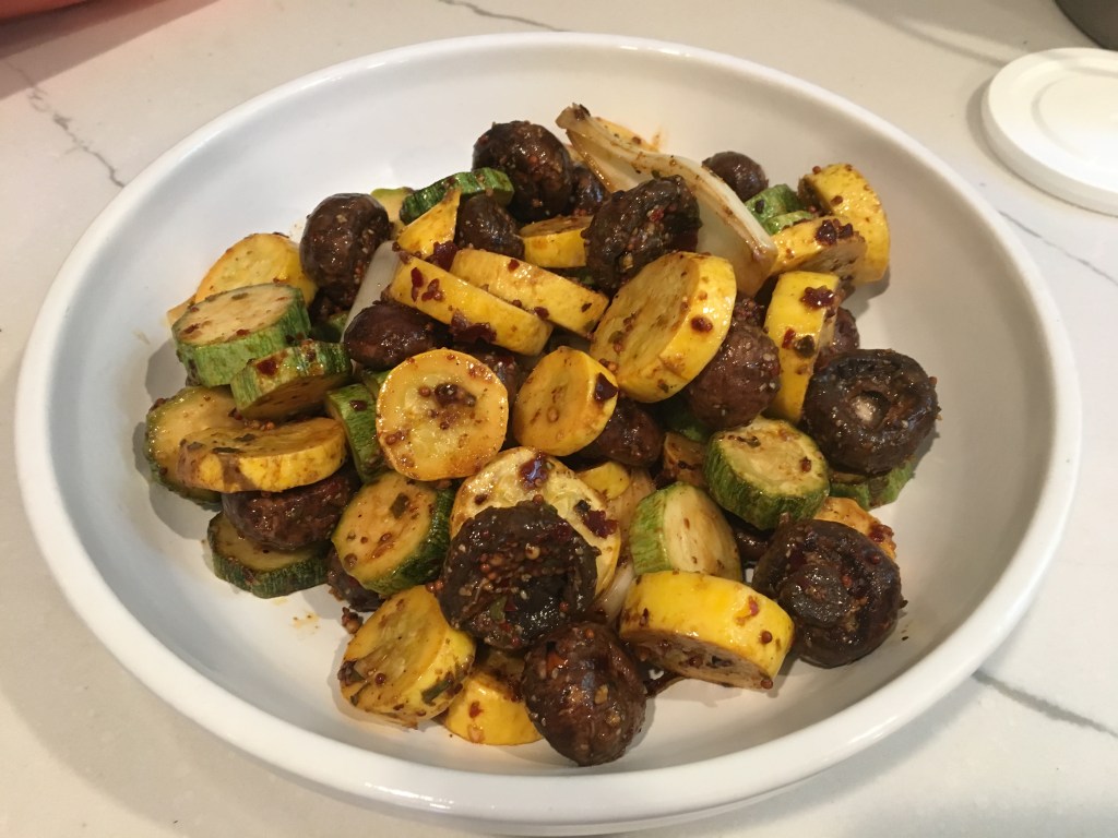Slice small zucchini, an eggplant, a pepper or two and maybe a couple of Yukon gold potatoes into bite-sized pieces. Toss with olive oil, minced garlic and your choice of other seasonings. Preheat oven to 375. Film a broiler or jelly roll pan with olive oil. Spread out on the pan and roast until tender when pierced with a fork, usually about half an hour, depending on the type of vegetable. Toss with hot pasta or rice and sprinkle with parmesan. Viola! Serve with a crisp salad for a perfect summer side or main dish.