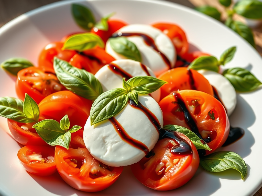 Layer slices of ripe tomatoes, fresh mozzarella, and basil leaves. Drizzle with balsamic glaze, olive oil, salt, and pepper.