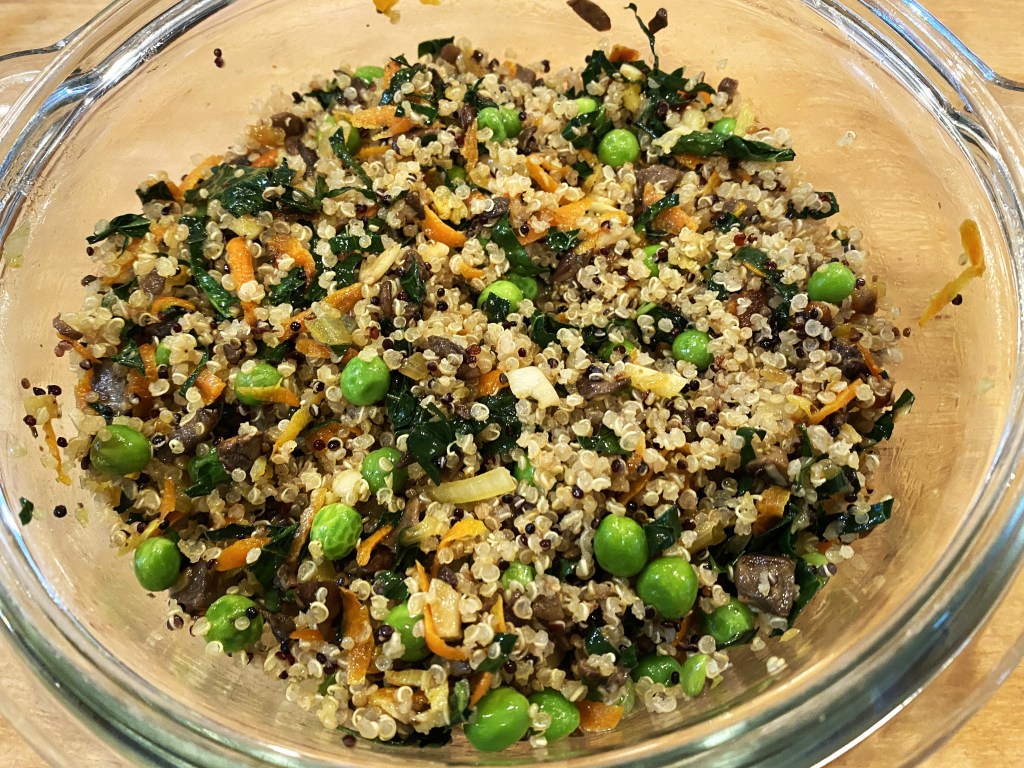 Chop onions and garlic and saute in a film of olive oil until translucent. Add chopped mushrooms, carrots, zucchini, green peas, broccoli, edamame and whatever else sounds good. Continue to saute until the vegetables are cooked to your liking.