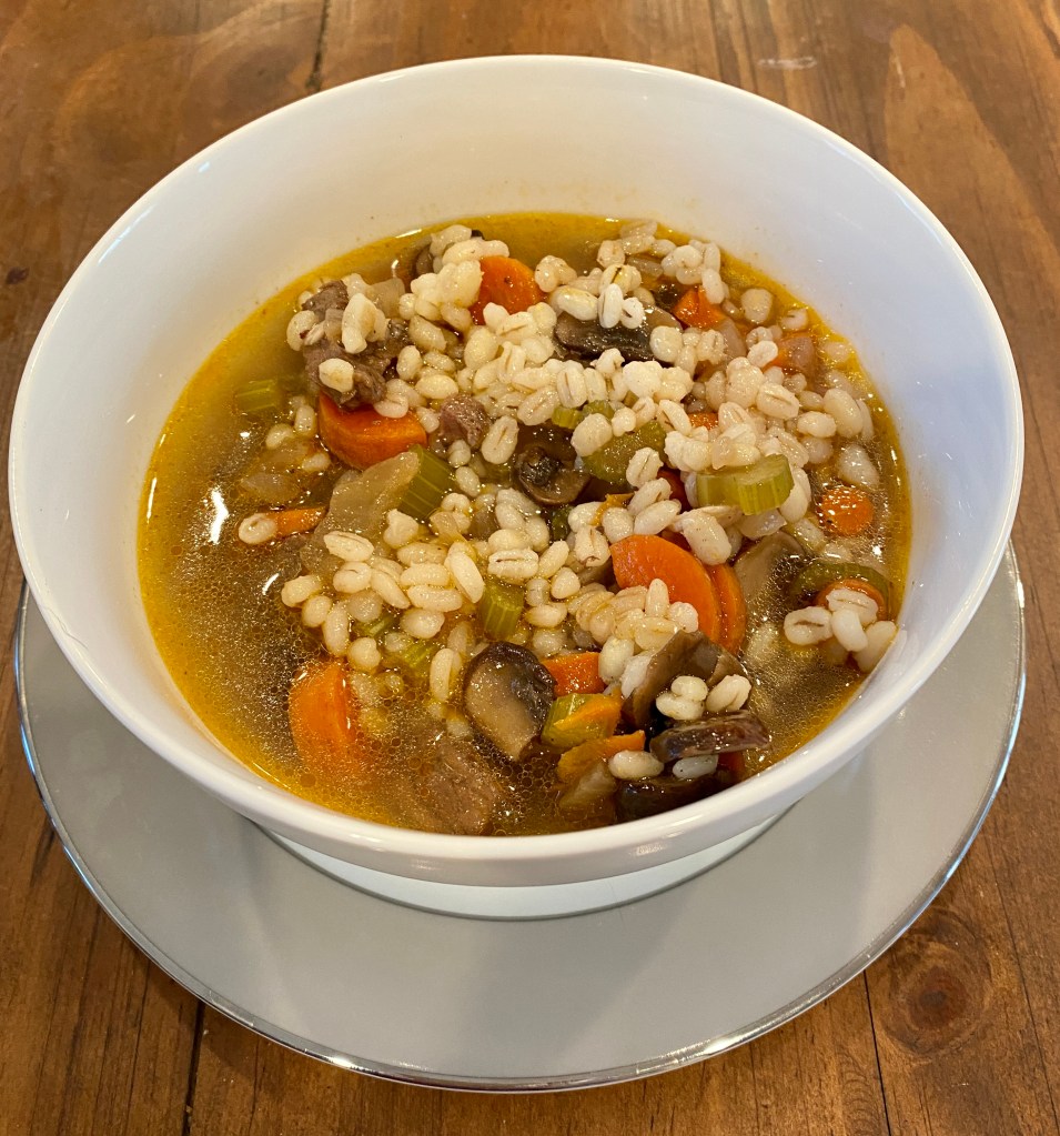 Add broth and bring to simmer. When vegetables are mostly tender, add barley, more stock if necessary and heat gently. Adjust seasonings and serve with crusty bread to soak up the juices.