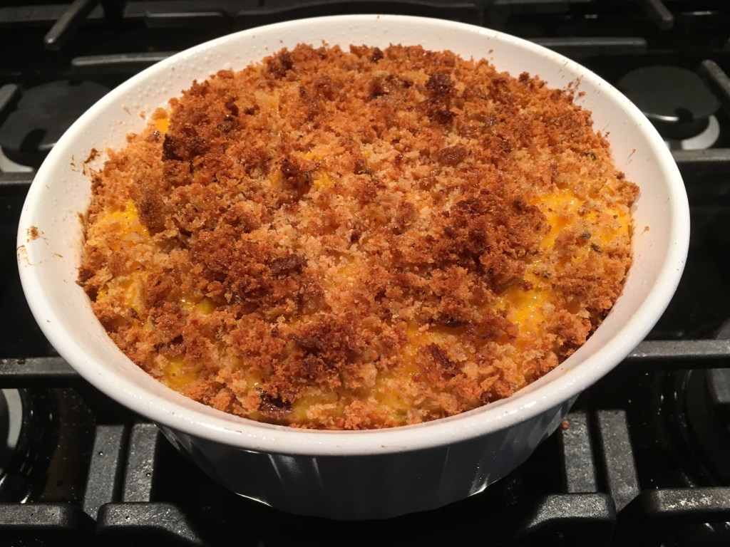 Cover bread with hot water and let stand until softened, 3-5 minutes. Drain and set aside. Saute onion and garlic in oil until tender. Mix bread, squash and rest of ingredients in a large bowl. Add onions and garlic. Spread in oiled 2 quart casserole and sprinkle with bread crumbs. Bake, uncovered 35 minutes until slightly puffed and beginning to brown.