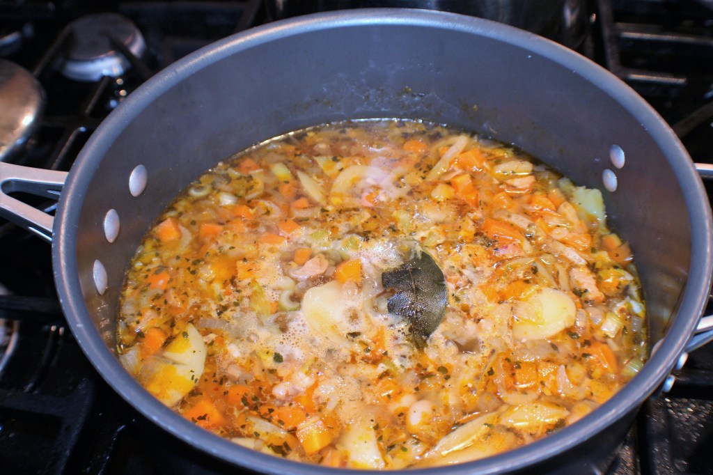 Heat olive oil in a large heavy-bottomed saucepan. Saute onion, carrot, celery and garlic if using on low-medium heat, stirring often, until the vegetables are soft. Add the rest of the ingredients and bring to simmer. Simmer until potatoes are soft when pierced. Season to taste and serve hot.