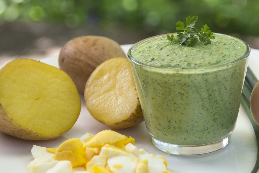 This lovely light green sauce can be modified in a lot of interesting ways, adding herbs like basil and dill, changing the carriers from mayonnaise to all yogurt, sour cream, creme fraiche, etc. You will love it on salmon, vegetables, potatoes and especially on freshly roasted asparagus.