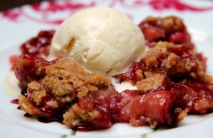 Top the fruit with the crisp mixture and bake 30 minutes for soft fruit; 45 minutes for harder fruits like apples and rhubarb. Top with vanilla ice cream, sweetened crème fraiche or whipped cream.