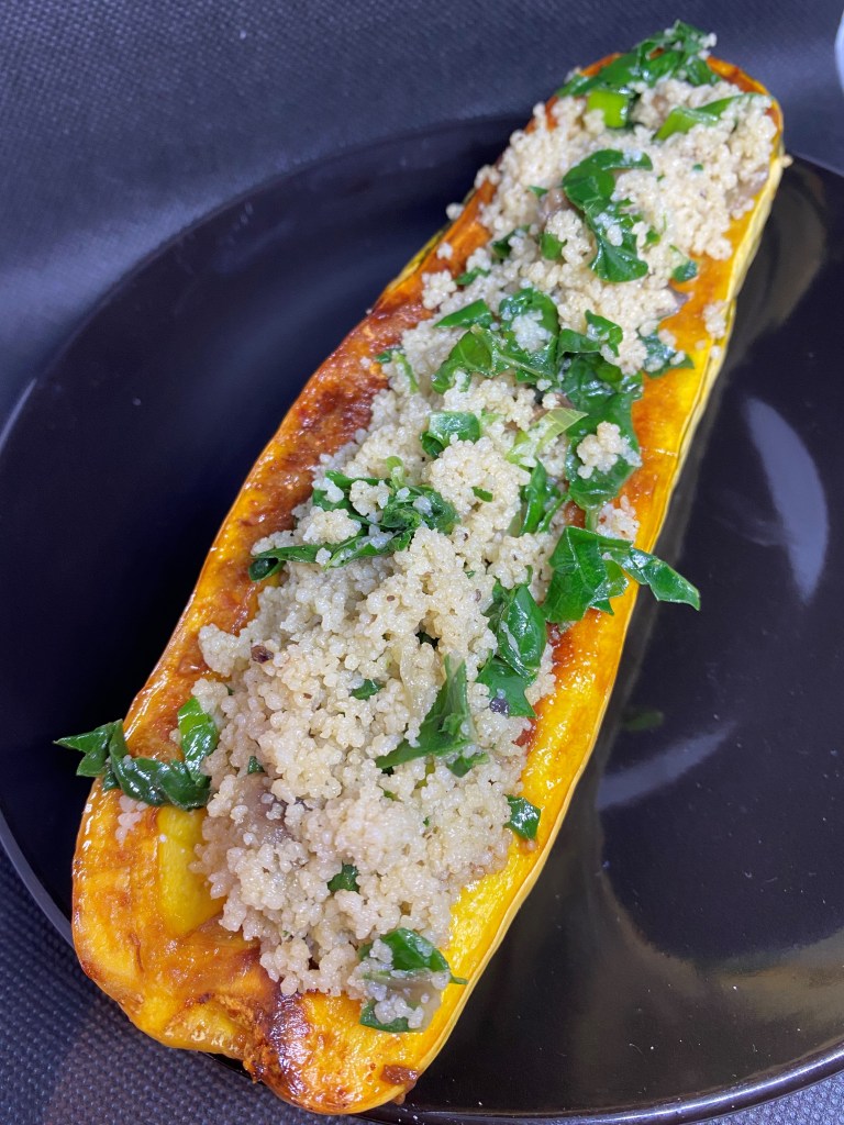 Fill the squash cavities with the couscous mix. Sprinkle with parmesan or other cheese of choice and slide under the broiler until delicately browned.