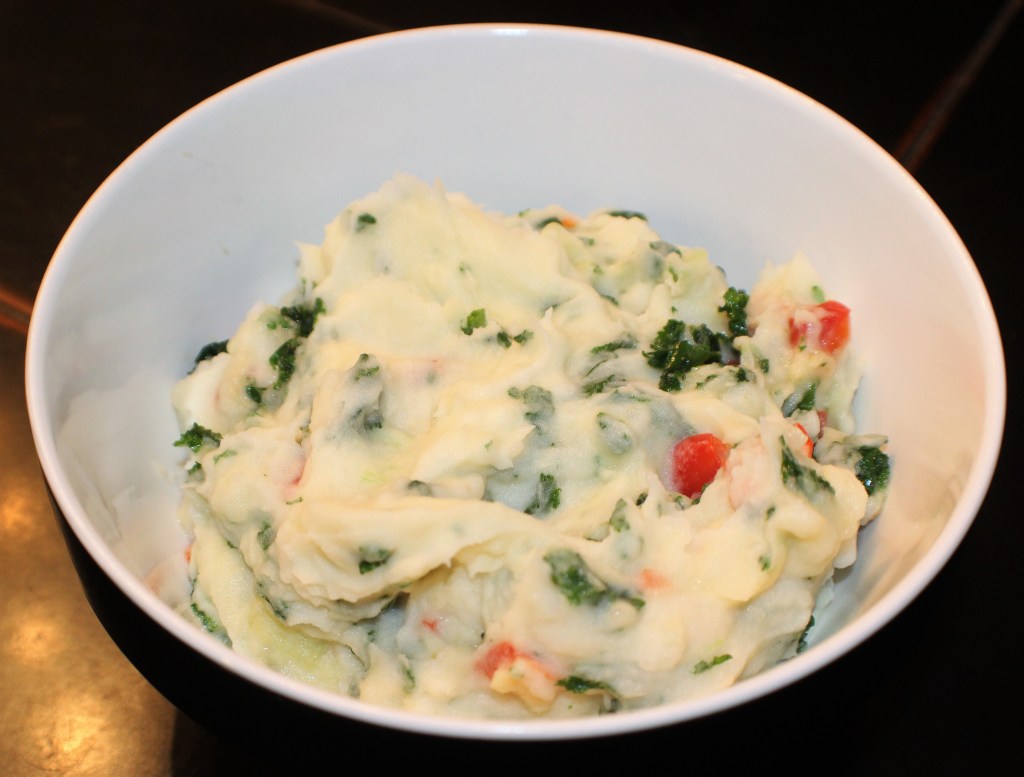 Mash the potatoes with a potato masher or mixer, using enough milk or cream to make them creamy but not runny. Combine with the vegetables and salt and pepper to taste. Smooth into an oiled casserole dish and add cheese and/or breadcrumbs if using. Bake about 30 minutes until the mixture is bubbly. Let stand ten minutes and enjoy!
