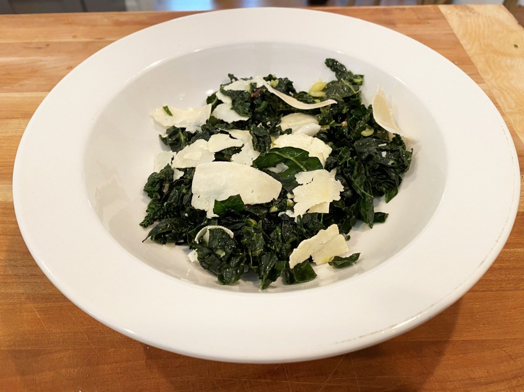 Once the kale is dark green and reduced considerably in bulk, squeeze the lemon juice over it. Adjust the salt, add pepper if you desire and garnish with plenty of fresh grated parmesan cheese. You will find this irresistible!