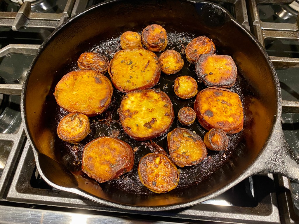 Preheat the oven to 475. Melt the butter in the microwave with the herbs if using. Toss the sweet potato slices well and put them in a single layer in a cast iron or metal roasting pan (don’t use glass).