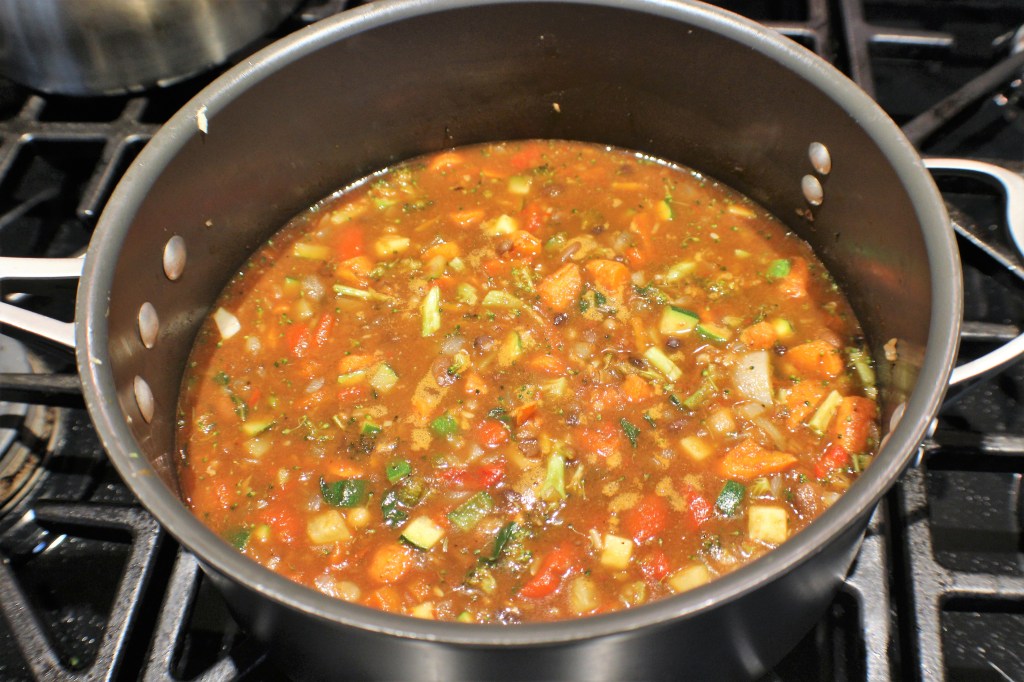 Chop a small onion, small carrot and a couple of stalks of celery. Saute gently in two tablespoons of olive oil until somewhat soft but not browned. While sauteeing, add seasonings and herbs to allow them to “bloom” in the oil. This process releases the flavors to infuse your soup.